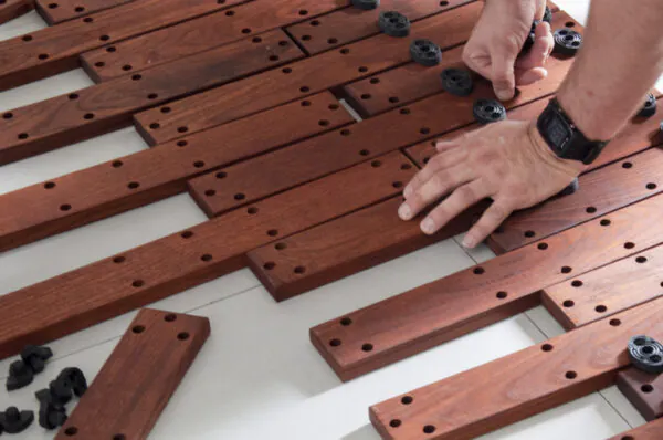 Próbka GUMI Wood składa się z 4 desek w różnych kolorach oraz 24 łączników GUMI. Jest idealna do wstępnego zapoznania się z Parkietem Balkonowym GUMI oraz umożliwia wybór najlepiej pasującego rozwiązania.